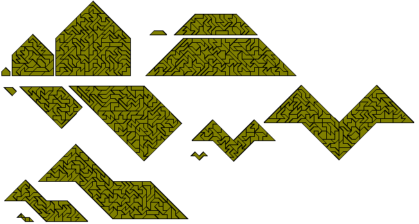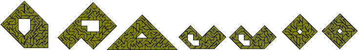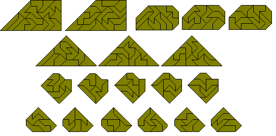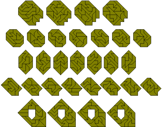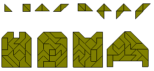 The polyaboloes (also known as polytans) are shapes formed by joining half squares (cut diagonally) together. There is one monabolo, three diaboloes, four triaboloes and 14 tetraboloes (see below). For more information on the tetraboloes see Henri Picciotto's site, Michael Keller's Game and Puzzle Pages and Miroslav Vicher's polytans page. Also Peter Esser has an excellent site with a lot of information on polyaboloes. Also Kadon Enterprises makes sets of polyaboloes up to and including the hexaboloes.