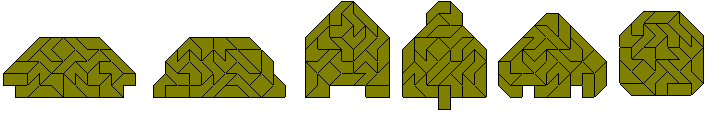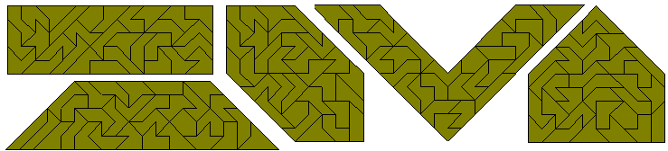 Since the total area of the pentaboloes is 75 square units, it should be possible to form quintuplications of the hexaboles using the set. Five examples are shown below. (Peter Esser's site has solutions for all 107 problems)