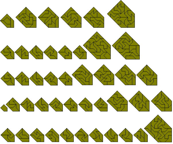 There are 56 one-sided pentaboloes shown in the constructions below where a variety of sets of similar shapes have been made with the pieces. For more one-sided pentabolo constructions see Peter Esser's constructions with the one-sided pentaboloes.