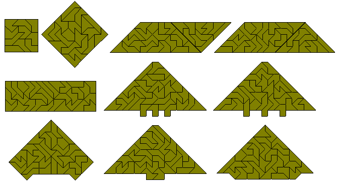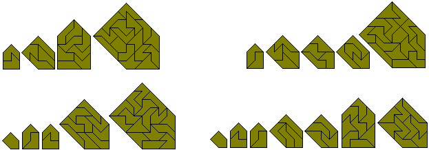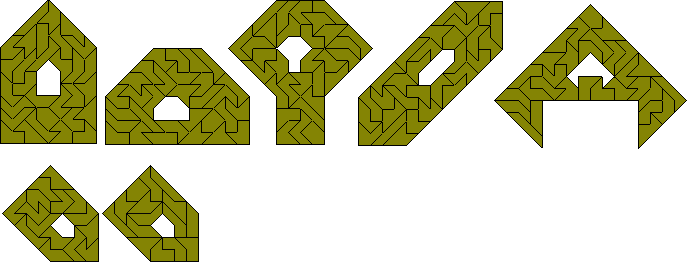 Although the 107 pieces cannot make any rectangle it should be possible to make one-, five- and nine-fold copies of some of the pieces. The pieces to be made must odd numbers of sloping edges in both directions as in the diagrams below by Peter Esser. As Peter points out not only must there be an odd number of sloping edges but also 1-5-9-replicas are possible only for the balanced pieces because there is an odd number of balanced pieces which gives an odd number of black triangles under checkerboard colouring for the whole construction.