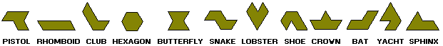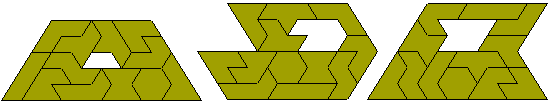 The set can, however, form simultaneous pairs of triplications with the piece triplicated omitted. The first four solutions here are by Pieter Torbijn who also claimed that these were the only solutions. However, Mike Reid recently found a solution for another one (see bottom right).