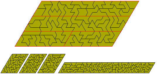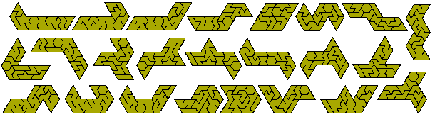 If we consider mirror image pairs as distinct then there are 19 hexiamonds. The full set cannot form any trapezium or parallelogram although 18 of the pieces can form a 3x18 parallelogram in 1440 ways. The solution below is in the form of two 3x9 parallelograms and all solutions decompose into two parallelograms. The number of solutions for the various decompositions is 4-14 (16); 5-13 (212); 6-12 (332); 7-11 (356); 8-10 (324) and 9-9 (200). Notice that one of the two snakes is absent from the solution below - this piece is absent from all 1440 solutions.