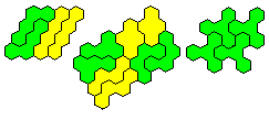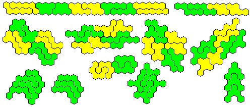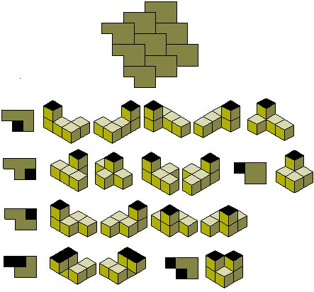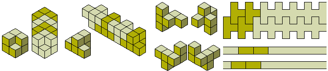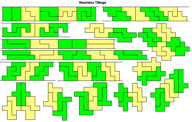 All hexacubes tile space. The 35 solid hexominioes tile and all but six of the others tile space from one or more of the hexomino tilings in a manner similar to the pentacubes.The remaining six hexacubes can be tiled as shown below. The diagram on the right is for the hexacube at the top left of the group of four and the other three tile with simple variations of this pattern. In each case a construction is formed which continues indefinitely and then can be joined with other such constructions to tile space.