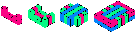 The diagram show (i) a single copy of the heptacube; (ii) three pieces joined; (iii) a second set of three pieces filling the 'gap' in the first three and (iv) the box completed with four more copies of the heptacube.