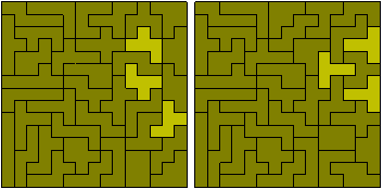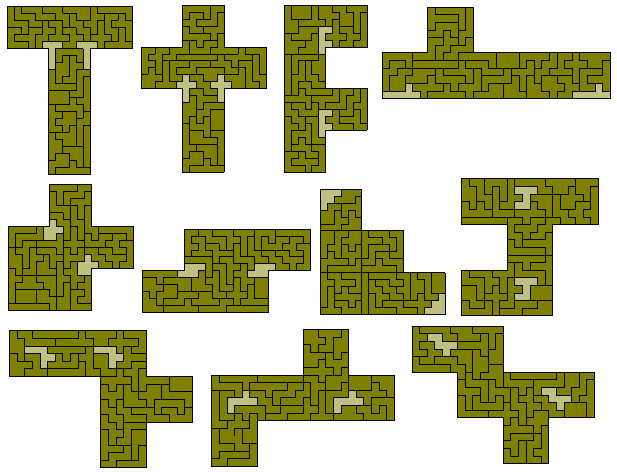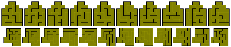 Here the problem is to create an hexomino construction with a hole of a similar shape. One solution is the sextuplication problem above. The other solutions below show the other three possible hole sizes - 14, 40 and 70 - as well as solutions to a two similar holes problem. These were made by Jean Meeus.