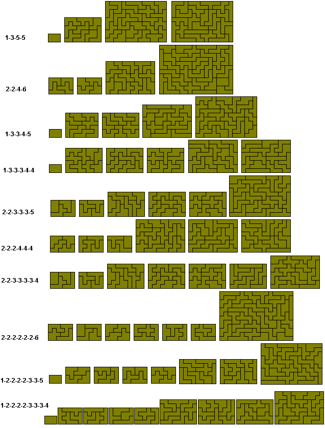 As with the 1-3-5 and the 1-3-3-4 problems above, a variety of multiple sized copies of pieces can be made with the set. Other possibilities for which no solution is known include 2-2-2-2-2-2-2-4-4 and 2-2-2-2-2-2-3-3-3-3.