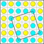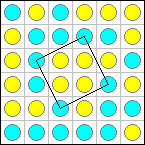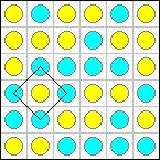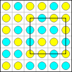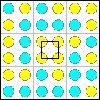 For example, the following arrangement of stones is a better solution for n = 6 than the above example because it has only 2 monochromatic squares.