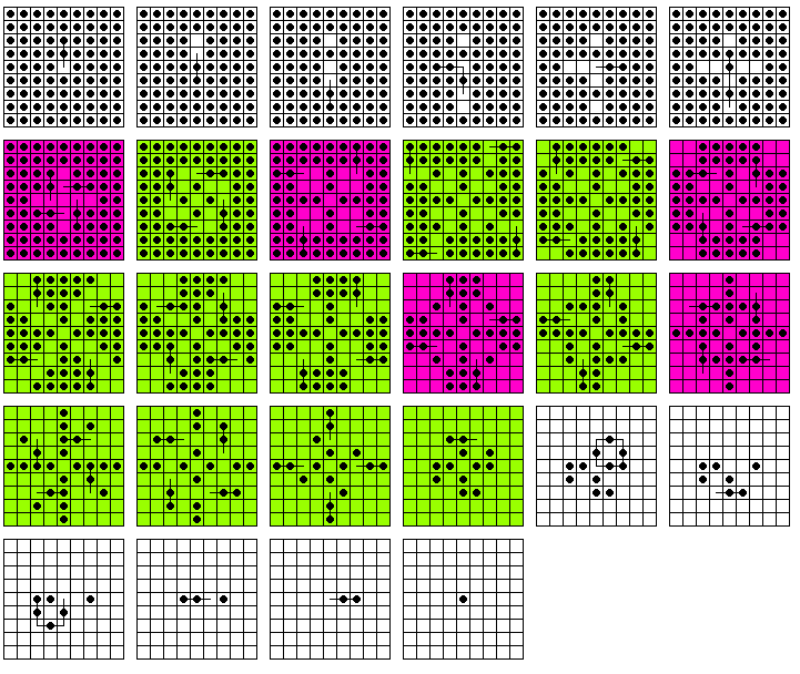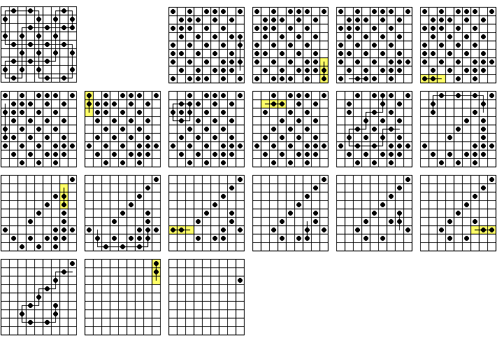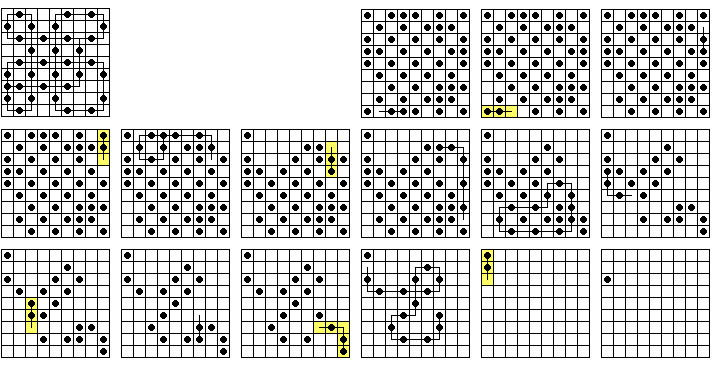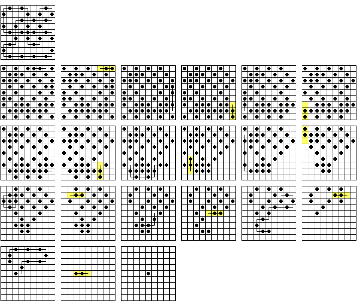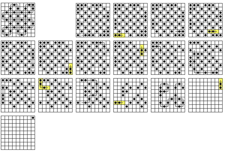 Note: The solution diagrams show how to play from the complement of the sweep positions to one peg. The solution ending with the long sweep can then be obtained by executing the jumps in exactly the reverse order, starting from a board position with one vacancy at the location of the finishing peg. In the diagrams, jumps that capture "white pegs" (see below) are colored in yellow. |