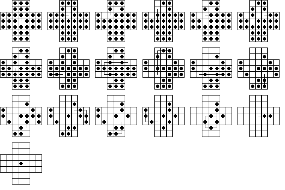 23 moves are required to reach these positions from the central vacancy. The positions with 9 pegs (the right three) can only be reached by using single jump moves. The rightmost board is also the only one (of 15 total) that can appear in a solution to the central game. | |||||||||||||||||||||||||||||||||||||||||||||||||||||||||||||||||||||||||||||||||||||||||||||||||||||||||||||||||||||||||||||||||||||||||||||||||||||||||||||||||||||||||||||||||||||||||||||||||||||||||||||||||||||||||||||||||||||||||||||||||||||||||||||||||||||||||||||||||||||||||||||||||||||||||||||||||||||||||||||||||||||||||||||||||||||||||||||||||||||||||||||||||||||||||||||||||||||||||||||||||||||||||