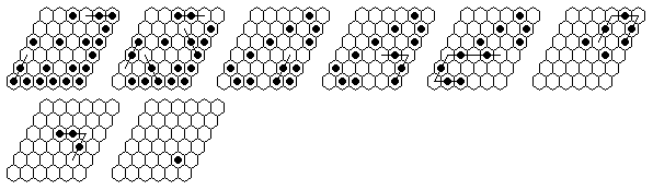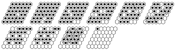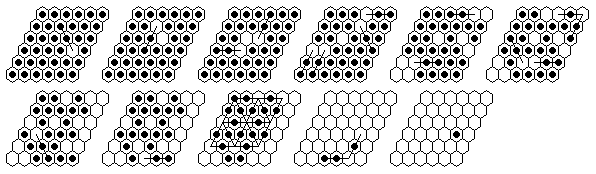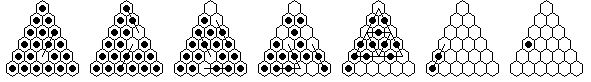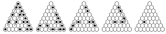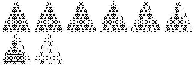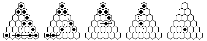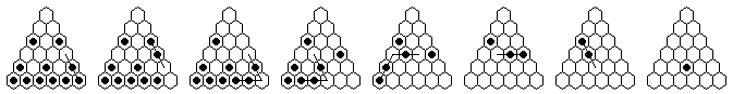 Note that many solutions are possible, and you do not have to execute the moves in the order shown in the diagrams. The solutions shown are optimized, it is more natural to make many jumps in one section of the board before moving on to another section. The forward solutions are also optimized, and do not use the exact same jump sequence reversed. Often, by reordering the jumps, you can get a shorter solution than you get from a reversal.
