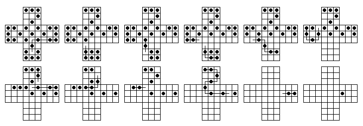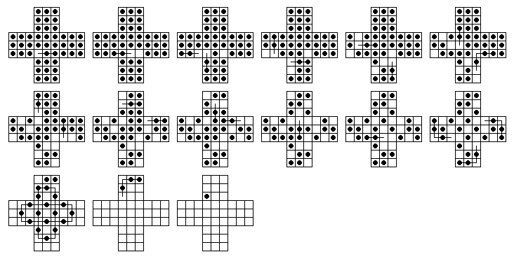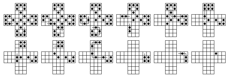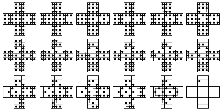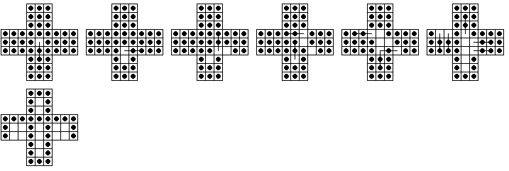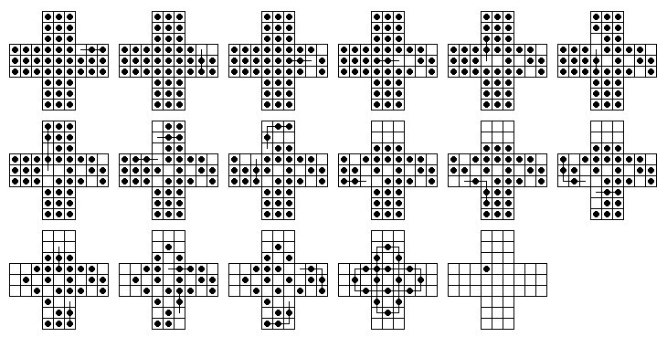 For the central game on the 45-hole Wiegleb's Board, the following table shows the size of the sets Bn and B-n. The 8-fold symmetry of the problem was taken into account, plus the resource count at the top of this page. For the forward problem, we can ignore any board position where this resource count evaluates to less than 0 (this has no effect until n=7). For the backward problem, we can ignore any board position where this resource count evaluates to more than 4 (this has no effect until n=2). Without this resource count the board counts at the final level would be approximately twice as large.