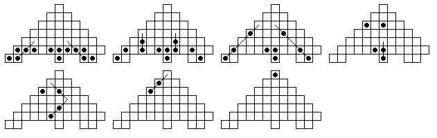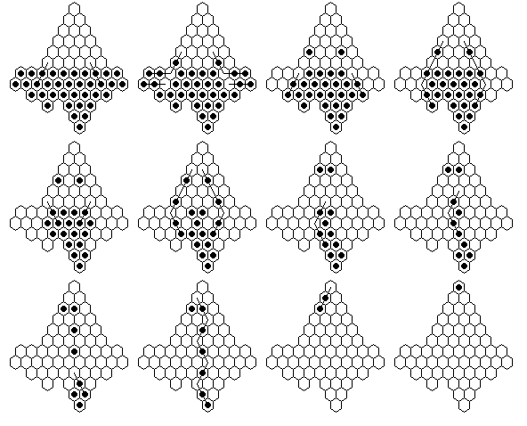W6. | Stephen Hartke has studied the problem in reverse, i.e. starting with one man and moving him down to form an army. In this paper he and Pieter Blue consider the puzzle where an infinite number of jumps are allowed. | |