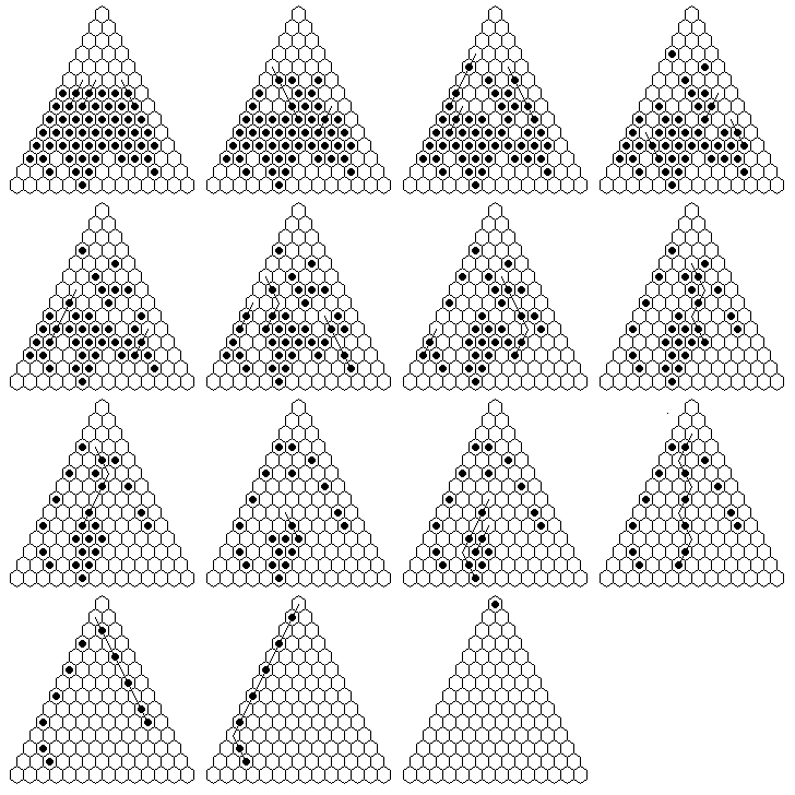 This version has a particularly simple pagoda function. Note that any upward jump loses nothing in regard to this pagoda function. Any horizontal jump loses an amount equal to the hole jumped over, and any downward jump loses twice this amount. The best solutions involve almost exclusively upward jumps.