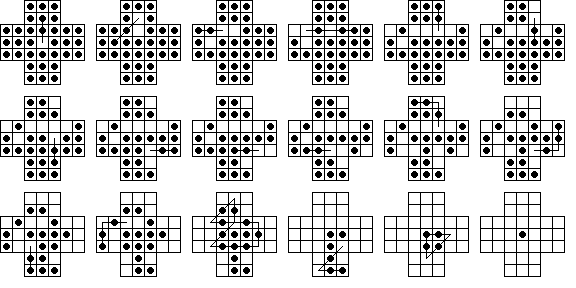 18 | 2 | 5 | An 18-move solution was discovered by E. Bergholt in 1912. Proved analytically to be the shortest possible by J. Beasley in 1962. Verified computationally. |