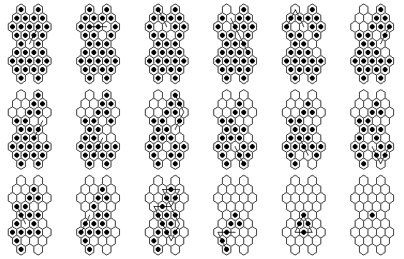 The resource count to the left is very useful when playing the Hoppers game. Conceptually, we can think of it as specifying that the removal of a corner frog at {c1, a3, e3, c5} ({A, C, K, M}) requires removal of a frog at {c2, b3, d3, c4} ({D, E, I, J}), and the absence of a frog at the center c3 (G). This is a very useful observation and makes the puzzle much easier. We can prove that certain single vacancy to single survivor problems are not solvable using this argument. For example, if we begin with c2 (D) vacant, the starting value of the resource count is -1, so we can only finish at a hole labeled -1, a corner. Remember, by definition, no jump can increase the resource count. |