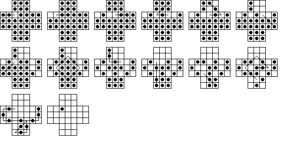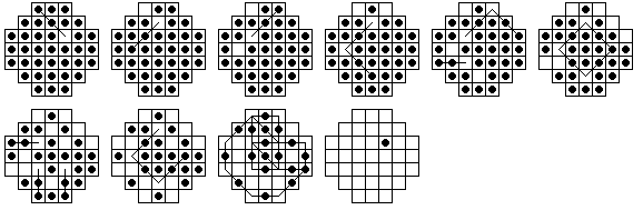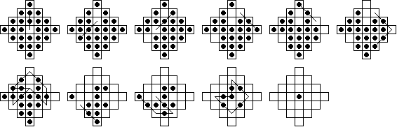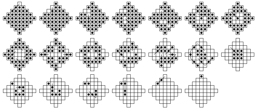 33-Hole Board (Standard) | 8-Move | 15 | 4 | 5 | 33-hole board with moves along both diagonals. Computational result. I have been able to prove that this problem cannot be solved in less than 14 moves. |